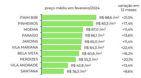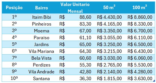 Desenvolvido em parceria pela Fipe e pelo ZAP, o Índice FipeZAP de Venda e Locação Comercial acompanha o preço médio de salas e conjuntos comerciais de até 200 m2 em 10 cidades brasileiras, com base em anúncios da Internet. Para o mês de fevereiro de 2024, os 10 maiores valores unitarios de locação para São Paulo foram: